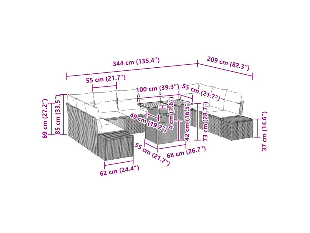 - Komplexní komponenty: Sada zahrnuje dva boční sofa, dva rohové sedáky, šest centrálních sedáků a zahradní stolek. Každý sedací modul chytrým způsobem integruje funkci úložného prostoru, což poskytuje dostatek místa pro pohodlné uskladnění zahradních doplňků.