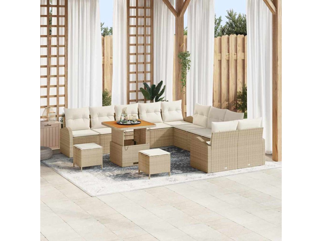 - Odolné materiály: Tato sada sofa je vyrobená z poly ratanu, oceli a masivního akáciového dřeva, takže vypadá skvěle a vydrží za všech povětrnostních podmínek. Tyhle materiály jsou vybrané pro svou sílu a styl, takže si zachovají šmrnc ve tvém venkovním prostoru.