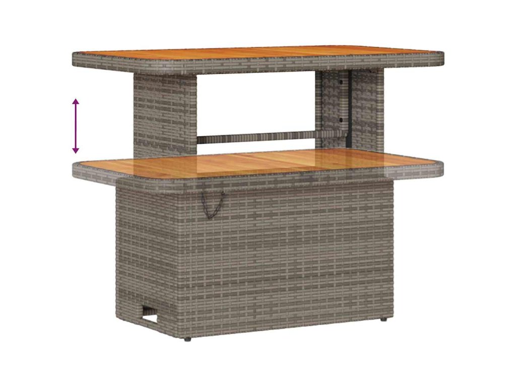 - Kvalitní materiály: Vyroben z poly ratanu a masivního akáciového dřeva. Tyto materiály zajišťují odolnost a trvanlivost vůči povětrnostním vlivům. Estetickou kombinaci moderního poly ratanu s přírodním dřevem zvýrazní jeho vizuální atraktivita a robustní konstrukce.