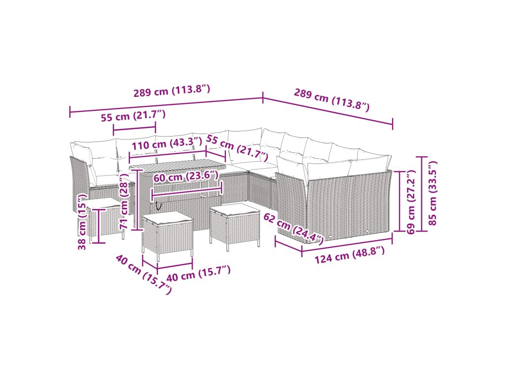 - 4 x Rohová sedačka: 62 x 62 x 85 cm (ŠxHxV)