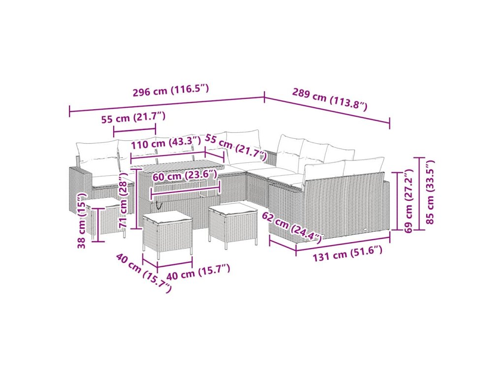 - Celkové rozměry: 296 x 289 x 85 cm (D x Š x V)