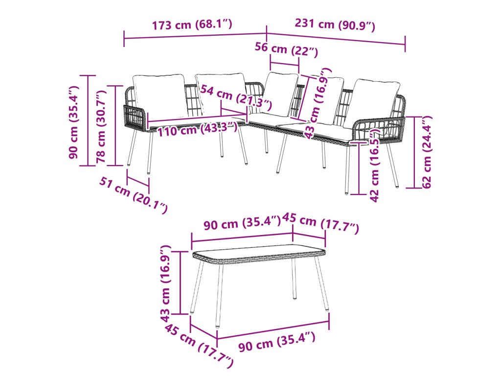 - 1 x venkovní pohovka: 231 x 173 x 90 cm (D x Š x V)