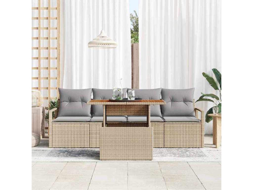 - Funkční prvky: Souprava obsahuje dvě pohovky s opěrkami a dvě středová místa se zabudovaným úložným prostorem pro vaše venkovní věci. K tomu pevný zahradní stůl z akáciového dřeva, ideální na jídlo nebo neformální setkání. Všechno je navržené tak, abyste měli uspořádaný venkovní prostor.