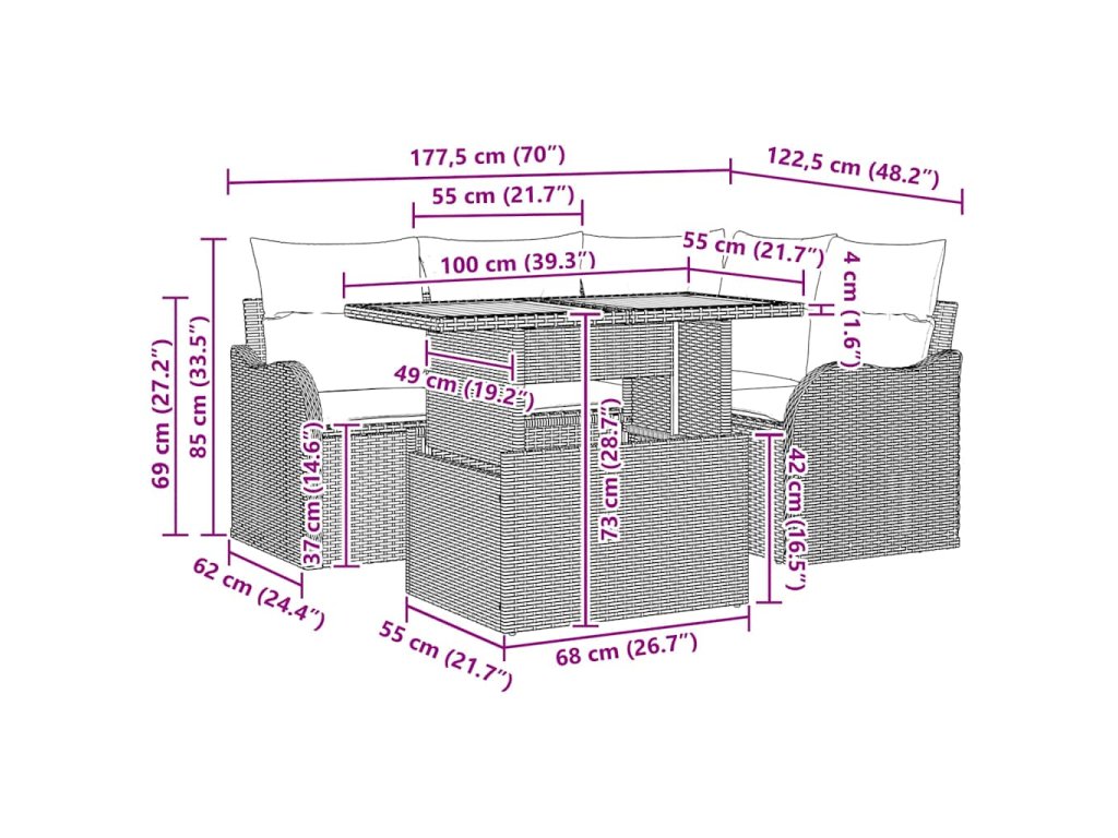 - Vlastnosti / Funkce / Design: Chytrý design využívá UV-odolné materiály, které udržují soupravu živou i na slunci. Zakřivené opěrky a polštáře zajistí maximální pohodlí během dlouhého lenošení, s elegantním minimalistickým stylem, který se hodí do moderních venkovních prostor.