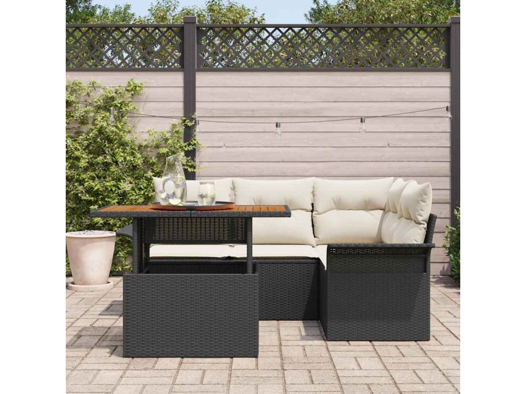 - Materiály a konstrukce: Vyrobena z odolného polyratanu, tato zahradní sedací souprava zajišťuje dlouhou životnost a skvělý vizuální dojem. Práškově lakovaná ocelová konstrukce poskytuje spolehlivou oporu, zatímco pevný akáciový dřevěný povrch nabízí přirozeně živý vzhled. Tyto materiály jsou pečlivě vybírány, aby zajistily maximální stabilitu, odolnost vůči počasí a atraktivní estetiku.