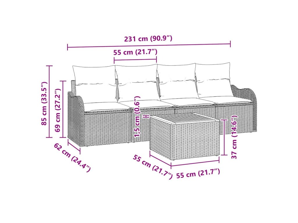 - Součásti Souprava má dvě hlavní sedačky, každé 55 x 62 x 85 cm, dvě pohovky s opěrkami 60,5 x 62 x 85 cm a stůl 55 x 55 x 37 cm, všechny navržené tak, aby skvěle pasovaly. Odnímatelné polštáře se zipem přinášejí pohodlí a přizpůsobení pro tvé sezení.