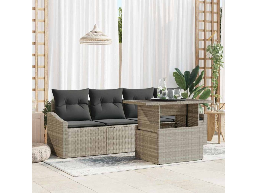 - Poly ratanová konstrukce: Zahradní pohovková sestava je vyrobena z kvalitního poly ratanu, což je praktické a moderní. Materiál je odolný proti počasí a zároveň vypadá skvěle, ideální pro venkovní použití.