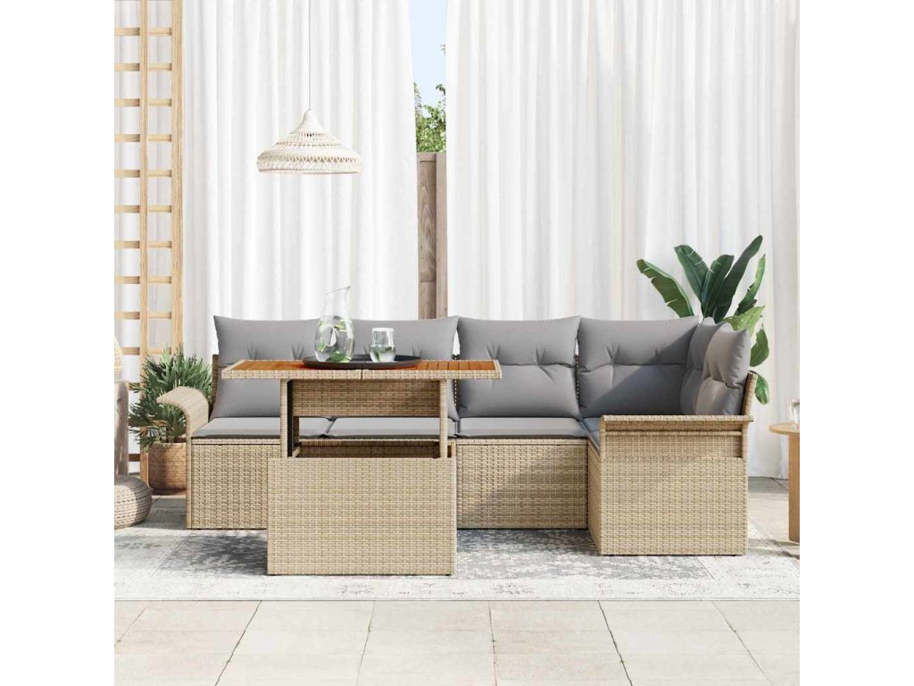 - Prémiové materiály: Vyrobena z robustního polyratanu a práškově lakované oceli, tato zahradní sofa sada je navržena na dlouhou životnost. Odolné akáciové dřevo přidává dotek přírodní krásy a zajišťuje trvanlivost. Volba těchto materiálů zaručuje, že tvůj nábytek zůstane atraktivní a funkční po mnoho let, bez ohledu na roční období.