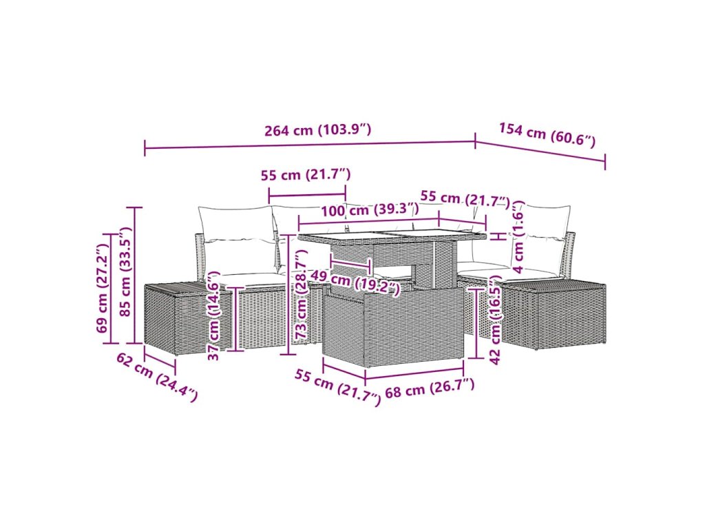 - Univerzální modulární uspořádání: Flexibilní uspořádání tohoto setu ti umožní přizpůsobit ho různým zahradním plánům a velikostem párty. Dvě boční pohovky, jedno rohové sedátko a dvě centrální židle ti umožní snadno přizpůsobit zarovnání pro různé příležitosti.