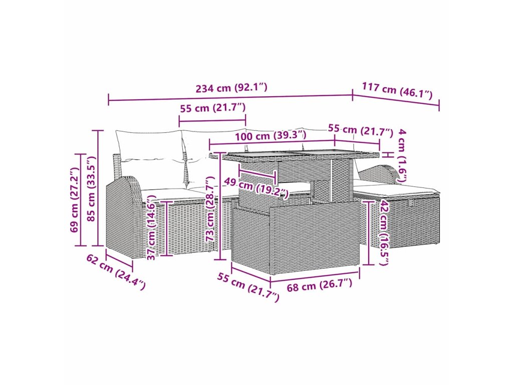 Tento obdélníkový venkovní jídelní set skvěle spojuje styl a praktičnost. Pohodlně pojme šest lidí a perfektně vylepší jakýkoli balkon nebo terasu. S moderním vzhledem a tkaným přírodním ratanem spolu s polyesterovou látkou, suitable for co se snadno čistí, je to ideální na venkovní setkání, rodinné jídla nebo uvolněné letní večery.