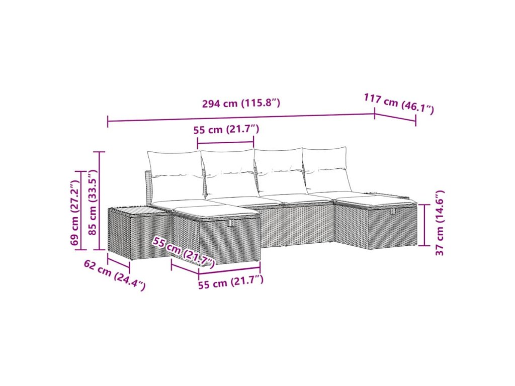- Zahrnuté komponenty: Souprava se skládá ze dvou centrálních sedadel, dvou pohovek a dvou taburetů, což vám nabízí spoustu míst na sezení. Zakřivené opěrky a odnímatelné polštáře usnadňují čištění. Každá část přidává na pohodlí, takže si můžete užívat společných chvil.