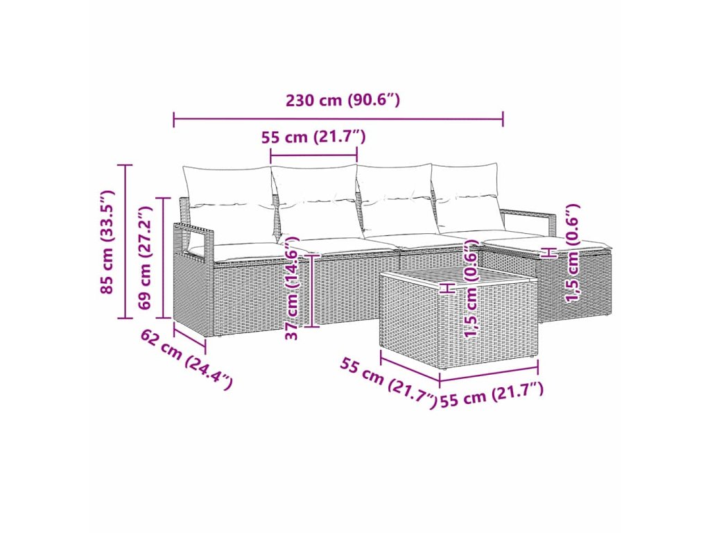 - 2 x střední sedák: 55 x 62 x 85 cm (D x Š x V)