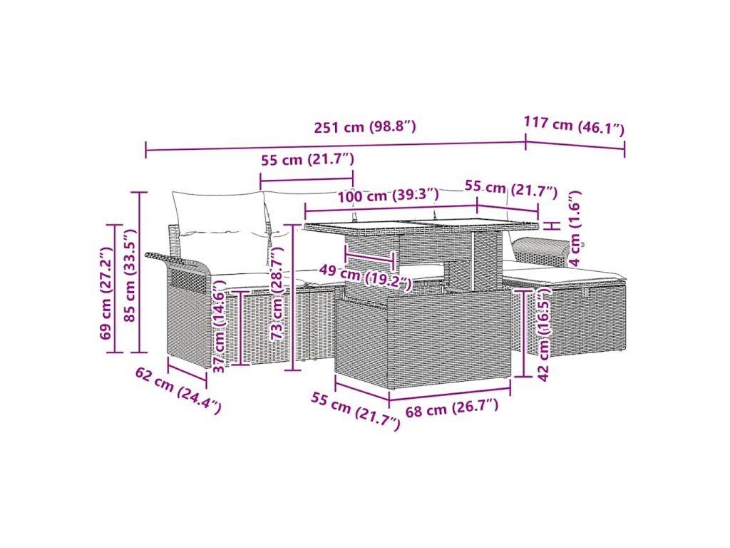 - Součásti setu: Set obsahuje dvě středové sedačky, dvě křesla, podnožku a praktický zahradní stůl s tvrzeným sklem. S pohodlnými sedáky a polstrováním na zádech, kombinuje styl s komfortem. Zúžené poly ratanové opěrky na ruce a zipované okraje polstrování přidávají další praktičnost a zvyšují váš venkovní zážitek.