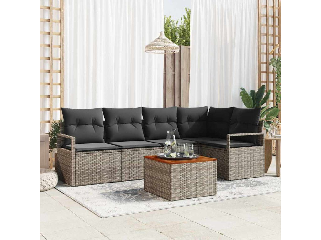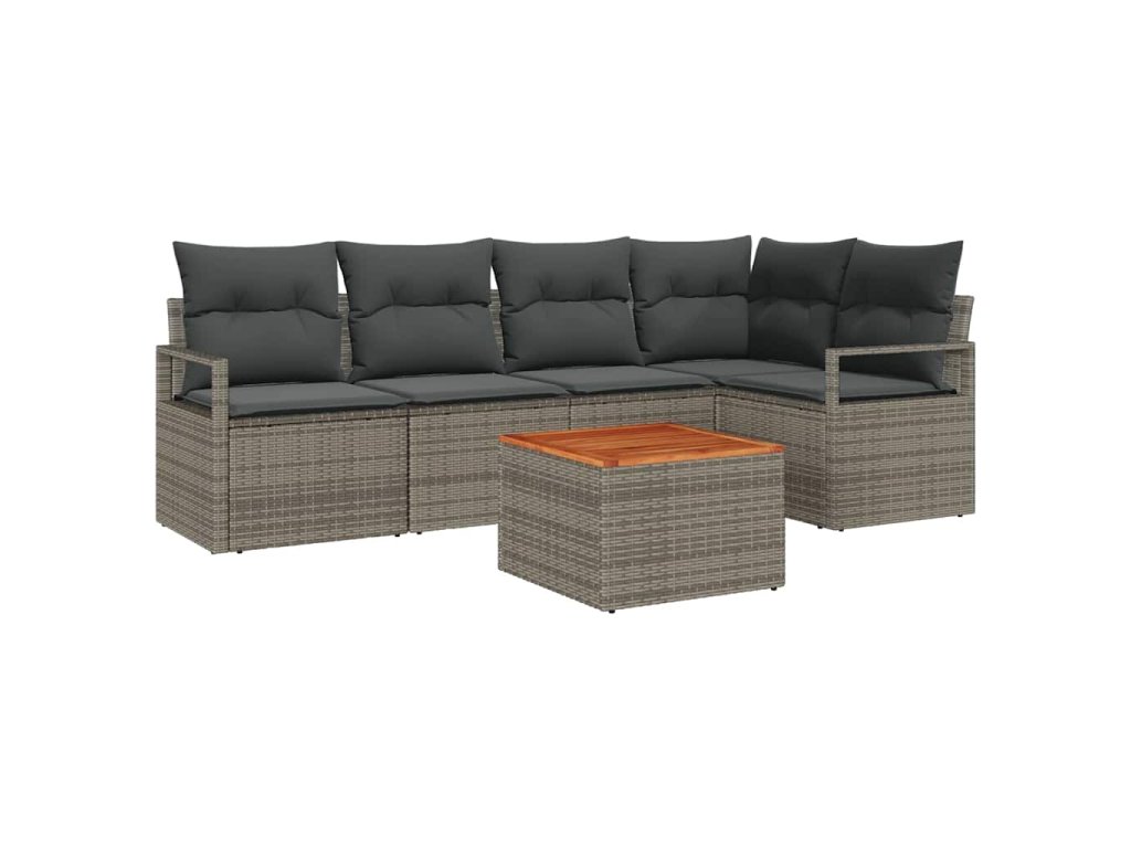 - Součásti: Sada obsahuje dva středové sedáky, rohový sedák, dva armrestové pohovky a zahradní stůl, všechny navrženy pro koherentní vzhled a bezproblémovou funkci. Plyšové polštáře zvyšují pohodlí, zatímco stůl nabízí solidní akáciovou dřevěnou plochu, ideální pro držení nápojů, knih nebo dekorací.