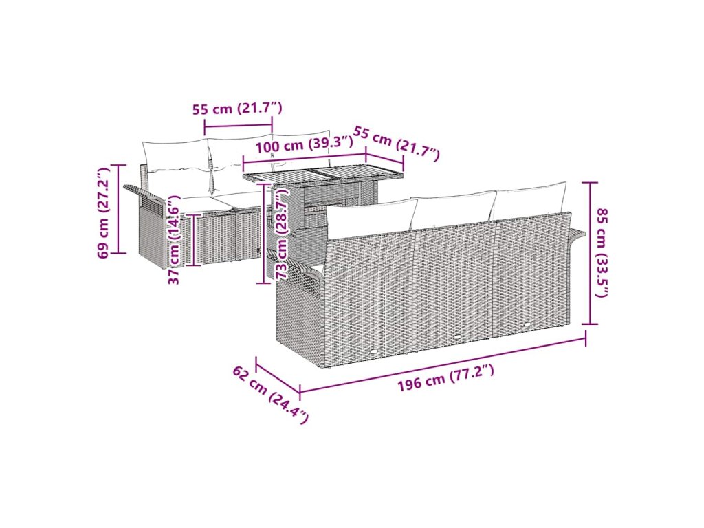 - Praktické Úložné Možnosti: S integrovanými úložnými prostory v opěrách a středových sedadlech, tato sada gauče nabízí praktická řešení pro uchovávání polštářů nebo jiných sezónních doplňků čistě uschovaných a chráněných před povětrnostními vlivy, když se nepoužívají.
