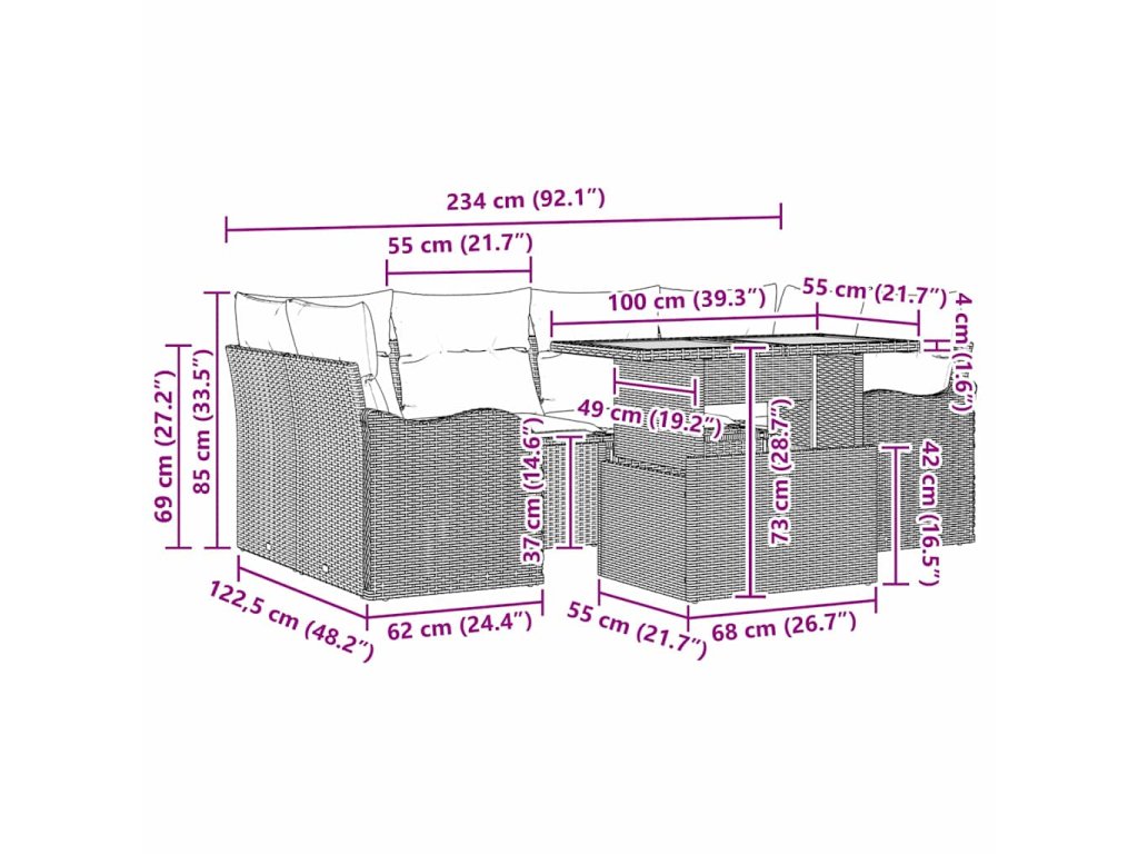 - Praktické komponenty: Sada obsahuje dvě křesla, pár rohových a centrálních sezení a zahradní stolek - každý kousek spojuje pohodlí a úložný prostor. Tyto komponenty mají venkovní polštáře odolné vůči povětrnostním podmínkám, což zajišťuje pohodlí a dlouhou životnost. Zakřivené opěrky rukou nabízejí ergonomickou podporu, která podporuje relaxaci bez omezení.