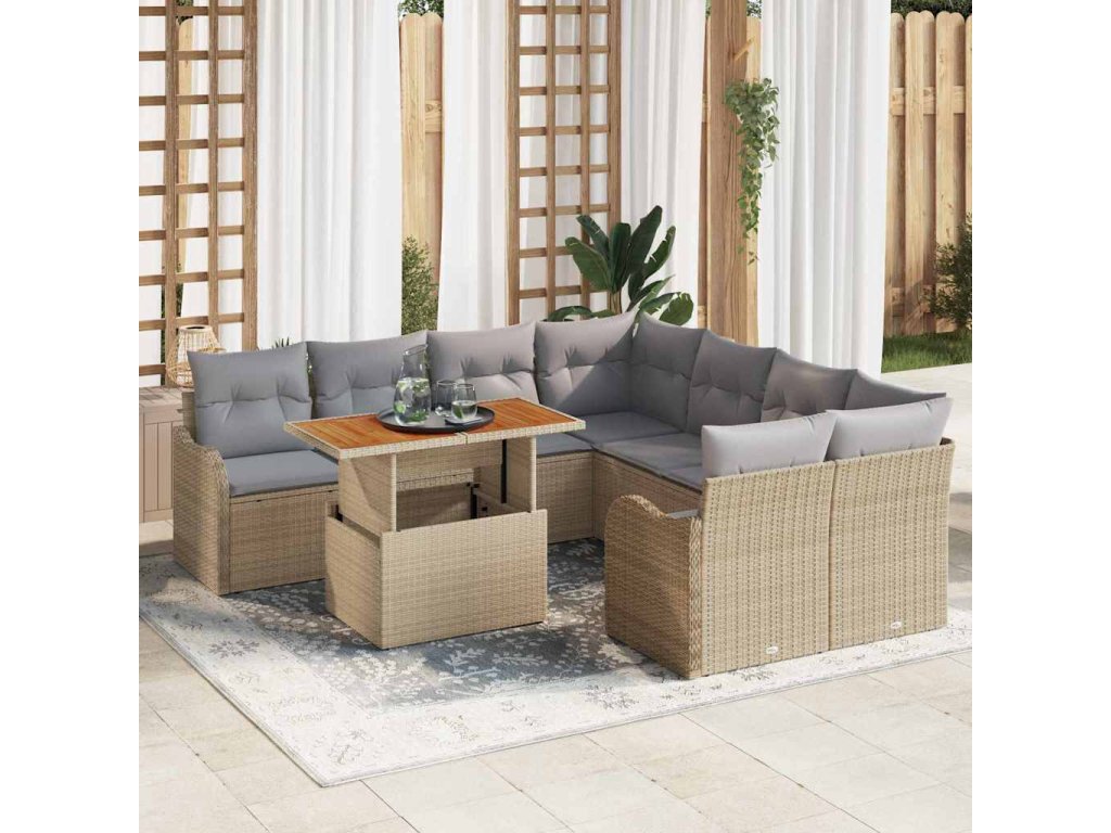 - Materiály: Tenhle zahradní sofa set je z polyratanu, což je známý materiál, který vydrží venkovní podmínky. Rám z práškově lakované oceli je pevný a stabilní. Desky z masivního akáciového dřeva dotvářejí přirozený a elegantní vzhled, což zaručuje roky stylu a užívání. Kombinace těchto materiálů znamená, že set je dost silný i při změnách počasí, a je skvělou volbou pro milovníky venkovního bydlení.