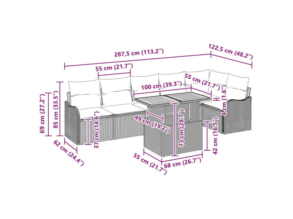 - All-in-One set: Tato souprava obsahuje dvě křesla s opěrkami, rohové sedadlo, tři střední sedačky a praktický zahradní stolek. A navíc, v sekčních sedadlech je úložný prostor, což pomáhá udržet všechno na dosah a v pořádku.