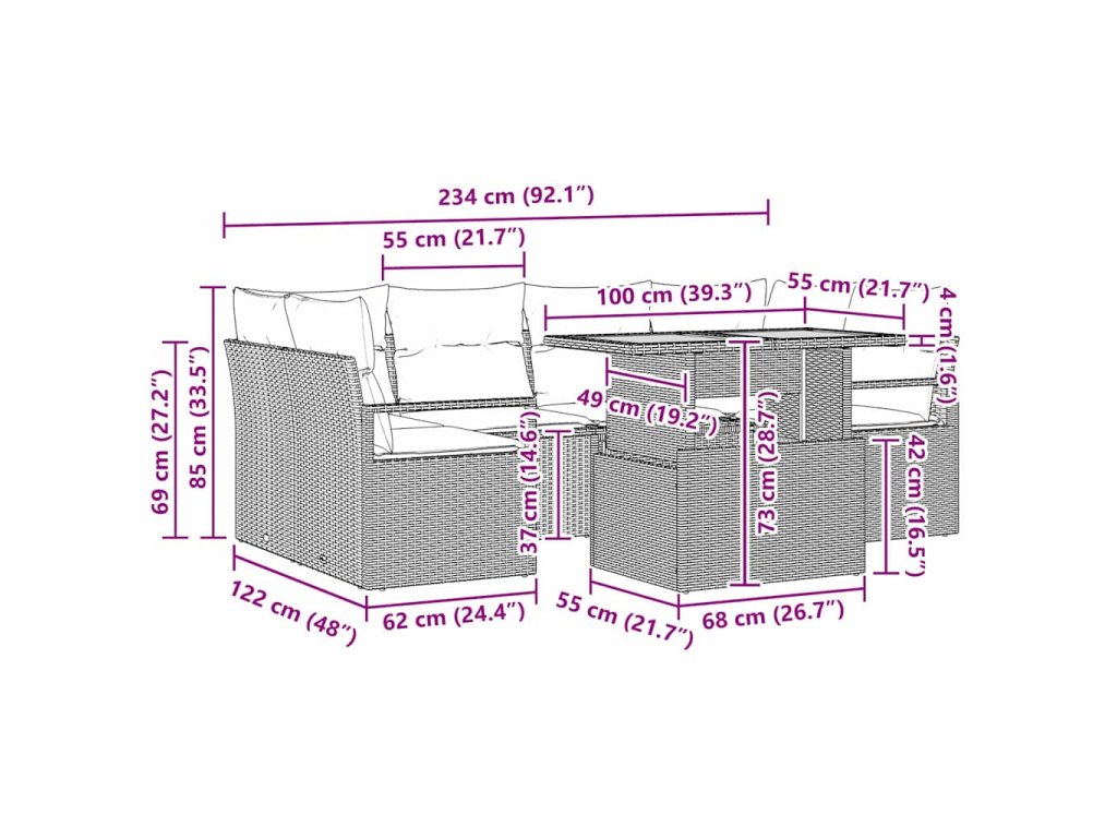 - Funkční úložné prostory Najdeš integrovaný úložný prostor v opěradlech a rozích sedadel, ideální pro schování dek nebo dekorativních polštářů. Udržuj svůj venkovní prostor uklizený a připravený na okamžité využití.
