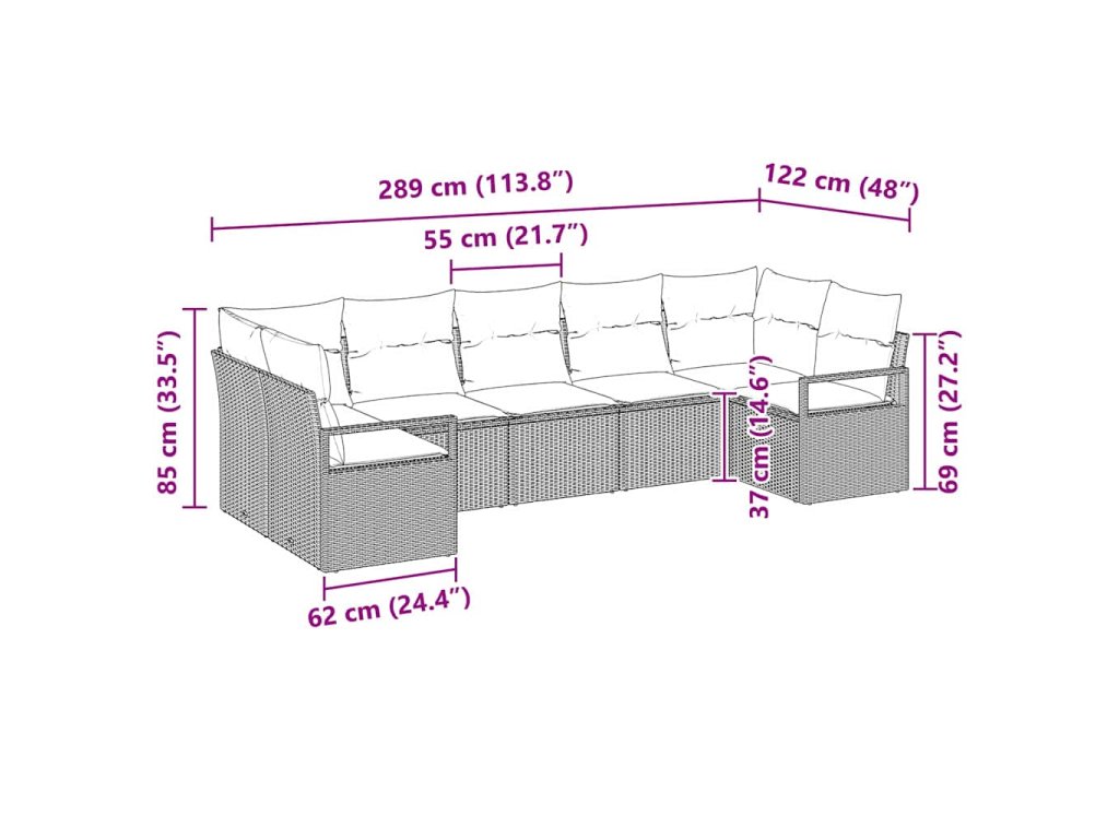 - Kompletní komponenty V sadě najdete dvě rohové sedáky o rozměrech 62 x 62 x 85 cm, tři středové sedáky o 62 x 55 x 85 cm a dvě pohovky s opěradlem o rozměrech 62 x 55 x 85 cm. Každý kousek byl navržen tak, aby nabídl flexibilitu a maximální pohodlí pro skvělé chvíle s rodinou a přáteli.
