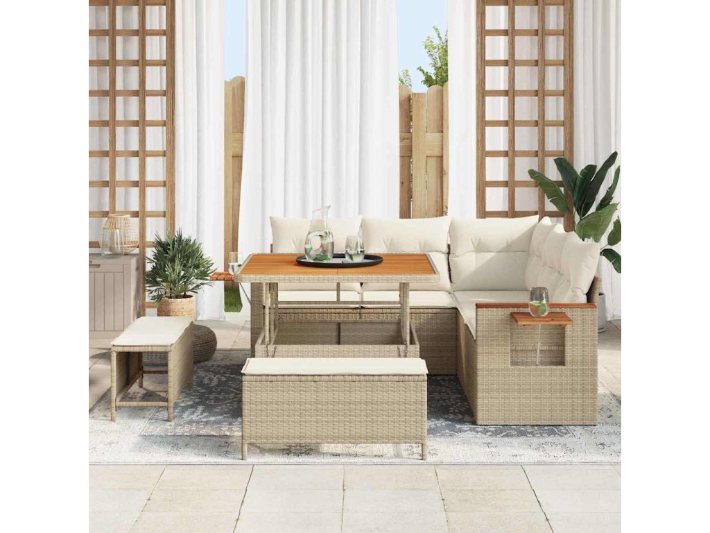 - Materiály: Sada zahradního gauče je z odolného poly ratanu s pevným rámem z práškově lakované oceli. Kombinace těchto materiálů ji dává odolnost vůči slunci a dešti, takže je ideální pro slunečnou terasu nebo stinnou zahradu. Teplé akáciové dřevo přidává designu přírodní nádech.