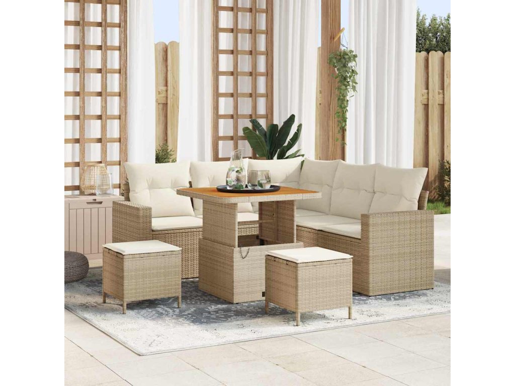 Kvalitní materiály: Tento set je vyrobený z polyratanu a práškově lakované oceli, což z něj dělá odolnou a stylovou volbu pro venkovní sezení. Materiály odolávají slunci a polyratan vypadá moderně. Ochranné povrchové úpravy: Povrch má matný vzhled, což podtrhuje moderní design. Hnědý akáciový povrch dodává přírodní a příjemný dotek. Designové prvky: Polštáře jsou snadno odnímatelné a vyměnitelné, což usnadňuje údržbu. Ploché opěrky rukou zvyšují pohodlí a estetiku, takže celkový vzhled je skvělý. Perfektní pro venkovní zábavu: Skvélé pro jarní a letní dny, tento zahradní pohovkový set je ideální pro venkovní akce, takže si můžeš užít slunečné dny stylově. Údržba a péče: Udržuj ho v top stavu používáním voděodolného krytu, když ho nepoužíváš. Jednoduše otři hadříkem, aby zůstal čistý během sezóny.- Barva: Béžová a krémová