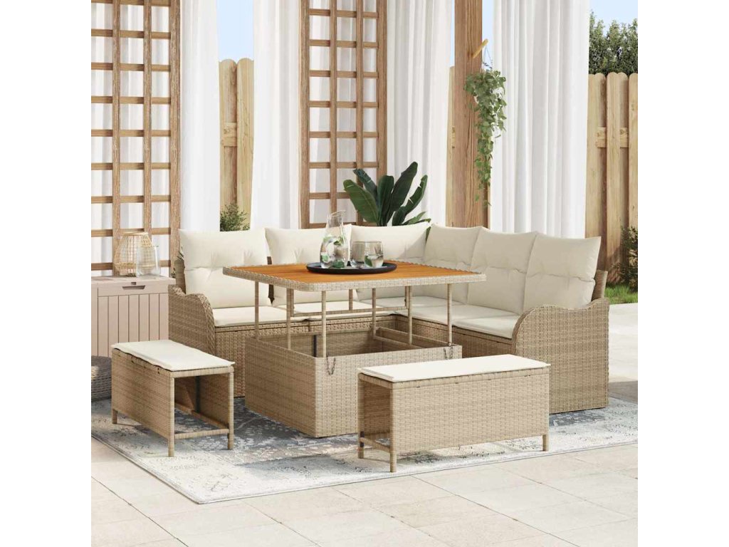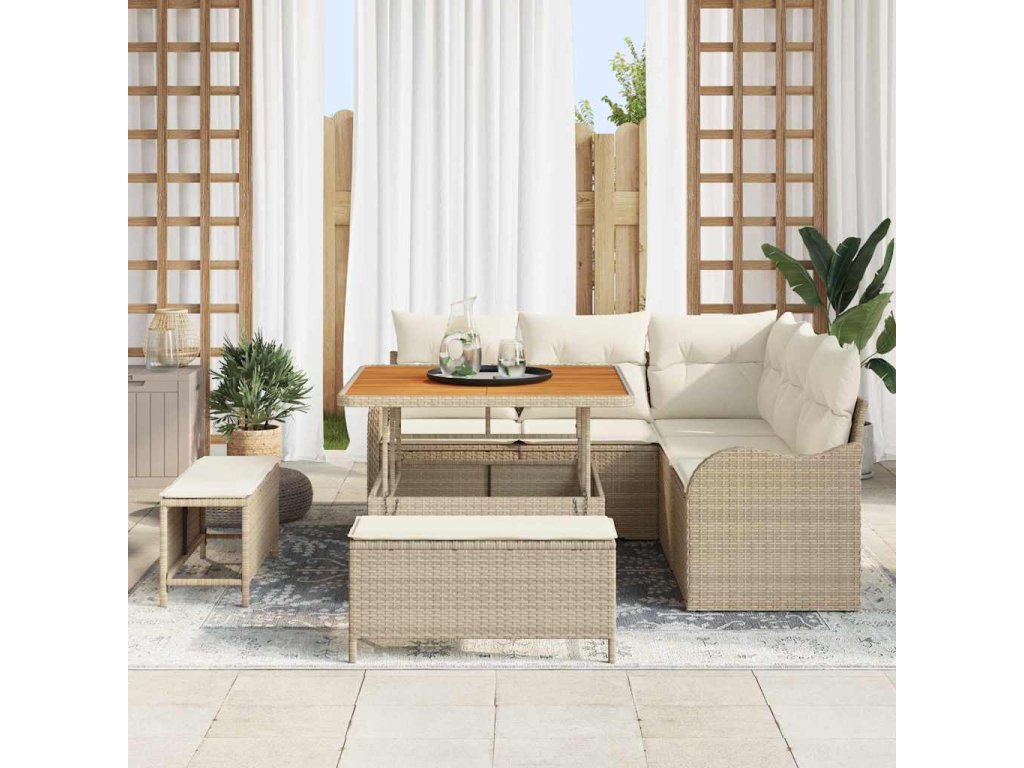 Kvalitní materiály: Úžasná kombinace polyratanu, oceli a masivního akáciového dřeva, která zaručuje dlouhověkost. Ratan dává stylový tkaný vzhled, zatímco ocel zajišťuje pevný rám, který je ošetřený tak, aby vydržel. Dokončovací detaily: Matný povrch sedací soupravy vypadá moderně a nenápadně. Práškově lakovaná ocel a polyratanový povrch se skvěle hodí do každého venkovního prostředí. Součásti: Obsahuje pohodlná pěnová sedadla a ratanové opěrky rukou. Nastavitelné zádové opěrky skvěle podpírají, a polštáře přidávají na komfortu. Praktické funkce: Nastavitelné nožičky zajišťují stabilitu na nerovném terénu a modulární design umožňuje uspořádání podle vašich potřeb. Souprava má také úložné možnosti na polštáře a další drobnosti, když nejsou v použití. Snadná údržba: Udržujte svou soupravu v parádním stavu použitím obalu, když ji nepoužíváte. Materiály jsou odolné vůči sezónním změnám a UV záření, takže zůstává krásná a funkční dlouho.- Barva: Béžová a krémová