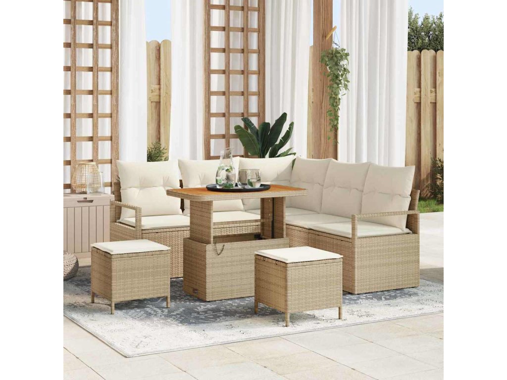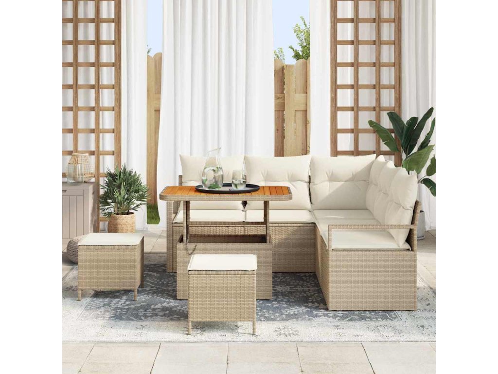Vysoce kvalitní materiály: Tato sedací souprava z poly ratanu nabízí stylový a odolný povrch, který vydrží venkovní počasí. Rámy z práškově lakované oceli jsou pevné a akáciové dřevo dodává celému designu elegantní nádech. Chytré funkce: S nastavitelnými nožkami je souprava stabilní i na nerovném terénu. Chytré úložné prostory udrží všechny tvoje zahradní věci pohromadě a prostor tak vypadá upraveně a organizovaně. Flexibilní design: Modulární konstrukce ti umožňuje uspořádat ji různými způsoby. Ať už chceš klidné místo na poklábosení nebo velký prostor pro akci, tahle sedací souprava se přizpůsobí tvým potřebám. Připravená na všechny roční období: Určená pro venkovní použití, UV odolné materiály chrání před vyblednutím a opotřebením od slunce, což z ní dělá spolehlivou volbu na slunečné dny venku. Snadná údržba: I když zvládne venkovní podmínky, kryt, když ji nepoužíváš, pomůže udržet ji v dobrém stavu po delší dobu s minimálním úsilím.- Barva: Béžová a krémová