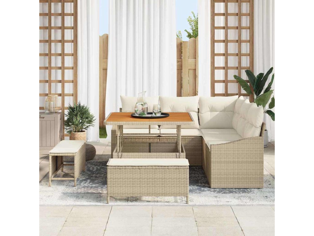 Prvotřídní materiály z polyratanu: Tato souprava využívá kvalitní polyratan, který skvěle vypadá a vydrží dlouho. Odolává UV záření a rozmarům počasí, takže je ideální na venek a zachová si svou krásu a užitečnost celou sezónu. Možnosti přizpůsobení: Funkce jako nastavitelné nožičky a modulární design umožňují uspořádat si ho přesně podle sebe. Ať už plánujete malou skupinu nebo velkou sešlost, můžete si to přizpůsobit. Úložné možnosti: Vestavěný úložný prostor je super pro schování polštářů nebo zahradního nářadí, aby všechno vypadalo hezky a udržovaně. Super pohodlné: Zakřivené opěrky a měkké pěnové polštáře vytvářejí příjemné místo k odpočinku. Je navržené tak, aby vás a vaše hosty drželo v pohodlí během dlouhých setkání. Snadná údržba: Díky práškované oceli a akáciovému dřevu se to udržuje lehce. Stačí klasický úklid a ochranné kryty, když je zlé počasí, aby to vypadalo skvěle.- Barva: Béžová a krémová