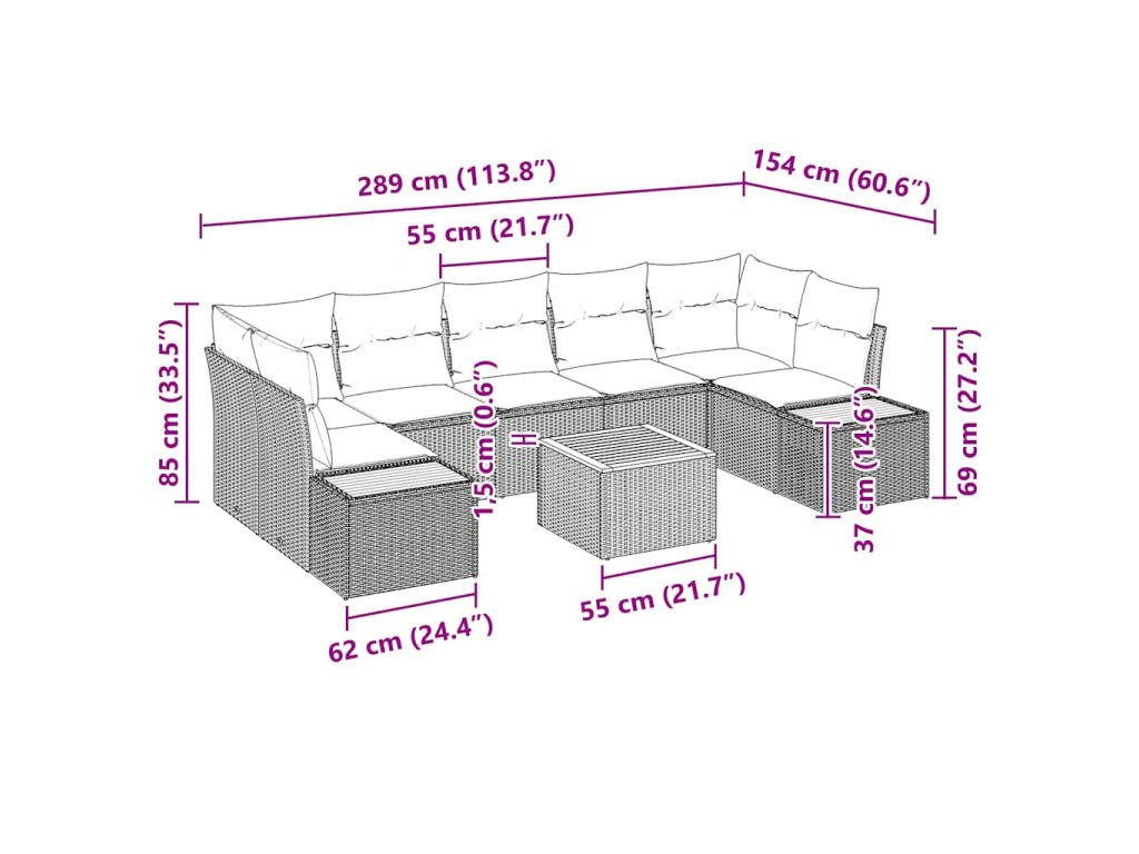 - Součásti: Tento zahradní set se skládá ze tří středových sedadel, dvou rohových sedadel, dvou bočních pohovek a jednoho zahradního stolu. Polyesterové polštáře zvyšují pohodlí, zatímco dokončená záda zajišťují reprezentativní vzhled z jakéhokoli úhlu. Každá součást je navržena tak, aby odolávala zkoušce času a venkovním prvkům.