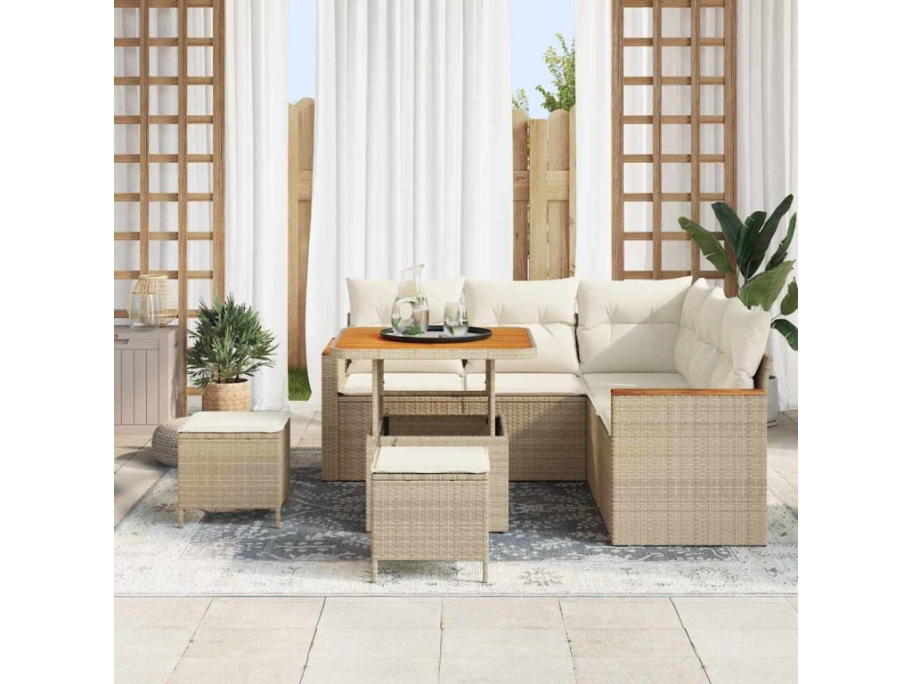 Robustní poly ratanová pletenina Tenhle nábytek je vyroben z odolného poly ratanu, co zvládá UV záření a různé počasí, takže ti dlouho vydrží a nepřijde o barvu. Skvělá volba, aby tvůj gauč byl stále pohodlný a stylový. Komplexní komponenty Set obsahuje výškově nastavitelný stůl a praktické vodotěsné úložné boxy. Bezproblémově přeměníš konferenční stolek na jídelní plochu a skryté úložné prostory v lavičkách pomáhají udržet vše na svém místě, a ještě to chrání před vlhkostí. Multifunkční prvky Tento set má stůl, který se dá snadno nastavit, aby fungoval jako konferenční i jídelní stůl. Všestranné kusy se přizpůsobí různým akcím, od posezení s přáteli po venkovní stolování, což dělá flexibilitu jednou z hlavních výhod. Venkovní použití Díky UV-odolným materiálům je set navržen pro venkovní požitek v zahradě nebo na terase. Každý kousek je odolný vůči vnějším vlivům, takže tvoje venkovní sezení zůstane krásné a funkční. Praktické pokyny k údržbě Aby set vypadal dobře co nejdéle, je dobrý nápad používat vodotěsný kryt, když ho zrovna nepoužíváš. Tím ochráníš každý kousek před špatným počasím, a to prodlouží jeho životnost a radost z používání.- Barva: Béžová