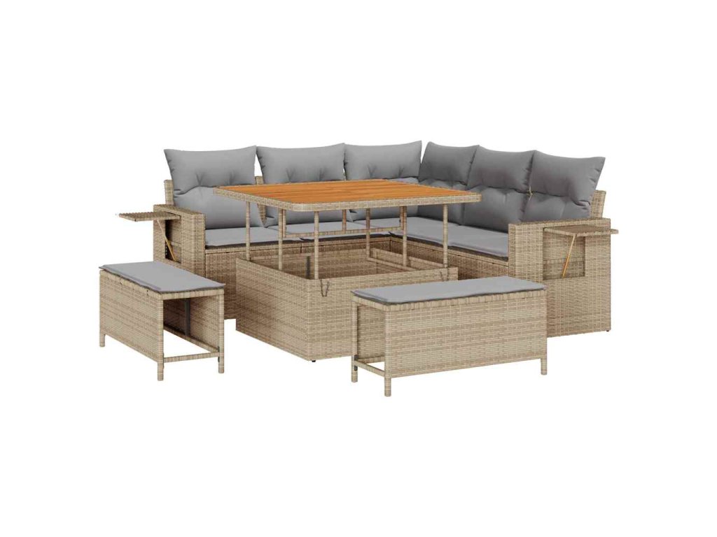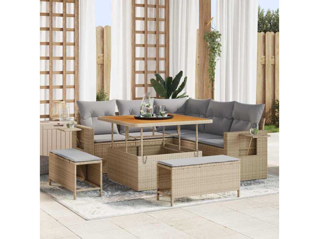 - Prémiové materiály: Sada modulárního zahradního gauče je z kvalitního polyratanu, známého svou odolností a schopností vydržet venkovní podmínky, což zajišťuje dlouhý životnost. Doplňuje ji masivní akáciové dřevo, které činí sadu přitažlivou a elegantní.