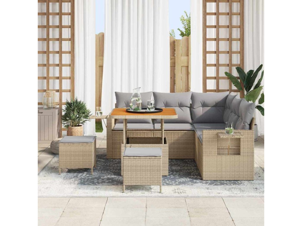 - Prémiové materiály: Sada modulárního zahradního gauče je z kvalitního polyratanu, známého svou odolností a schopností vydržet venkovní podmínky, což zajišťuje dlouhý životnost. Doplňuje ji masivní akáciové dřevo, které činí sadu přitažlivou a elegantní.