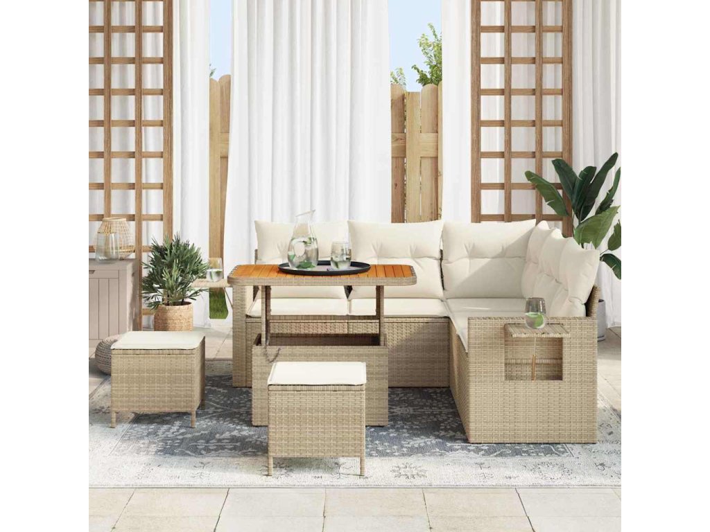 - Prémiové materiály: Sada modulárního zahradního gauče je z kvalitního polyratanu, známého svou odolností a schopností vydržet venkovní podmínky, což zajišťuje dlouhý životnost. Doplňuje ji masivní akáciové dřevo, které činí sadu přitažlivou a elegantní.