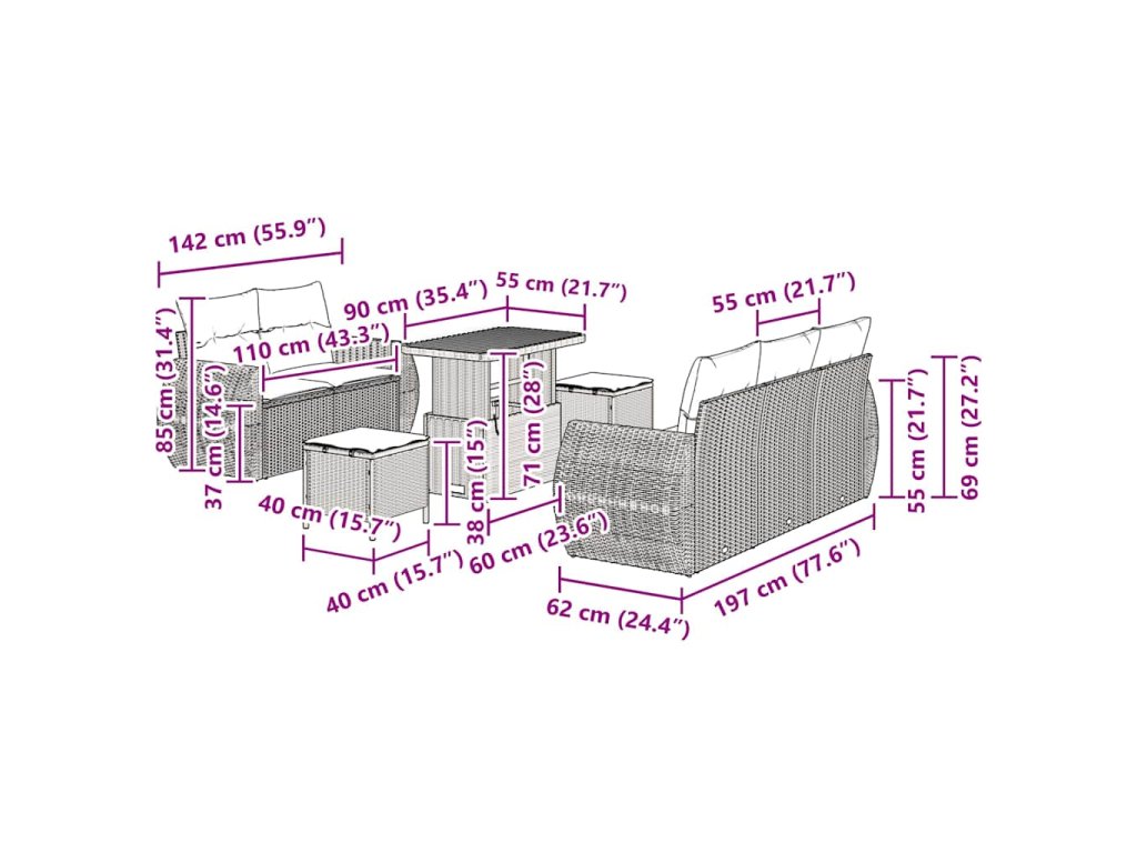 - Funkce / funkce / design: Díky výškově nastavitelnému stolku můžeš modulární gaučovou sadu snadno přetvořit z uspořádání café stolu na jídelní sestavy. Je lehká, takže ji jednoduše přemístíš a rychle přizpůsobíš různým uspořádáním a velikostem skupin. Tyto funkce zvýrazňují funkční design sady pro široké využití.