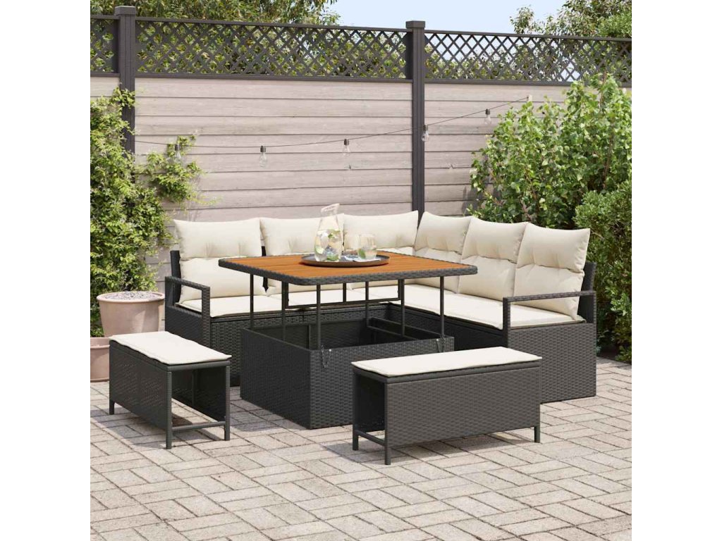 - Vysoce kvalitní materiály: Tato sedací souprava z poly ratanu nabízí stylový a odolný povrch, který vydrží venkovní počasí. Rámy z práškově lakované oceli jsou pevné a akáciové dřevo dodává celému designu elegantní nádech.
