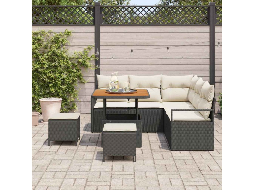 - Vysoce kvalitní materiály: Tato sedací souprava z poly ratanu nabízí stylový a odolný povrch, který vydrží venkovní počasí. Rámy z práškově lakované oceli jsou pevné a akáciové dřevo dodává celému designu elegantní nádech.