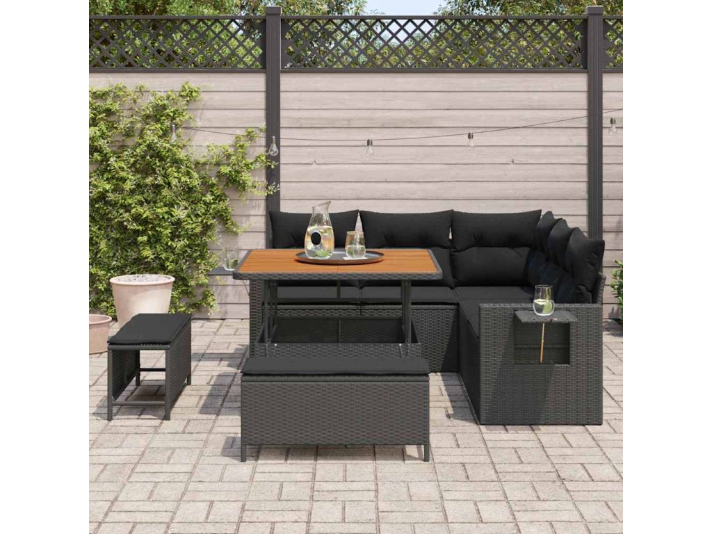 - Prémiové materiály: Sada modulárního zahradního gauče je z kvalitního polyratanu, známého svou odolností a schopností vydržet venkovní podmínky, což zajišťuje dlouhý životnost. Doplňuje ji masivní akáciové dřevo, které činí sadu přitažlivou a elegantní.