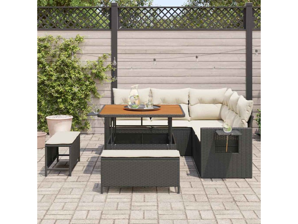 - Prémiové materiály: Sada modulárního zahradního gauče je z kvalitního polyratanu, známého svou odolností a schopností vydržet venkovní podmínky, což zajišťuje dlouhý životnost. Doplňuje ji masivní akáciové dřevo, které činí sadu přitažlivou a elegantní.