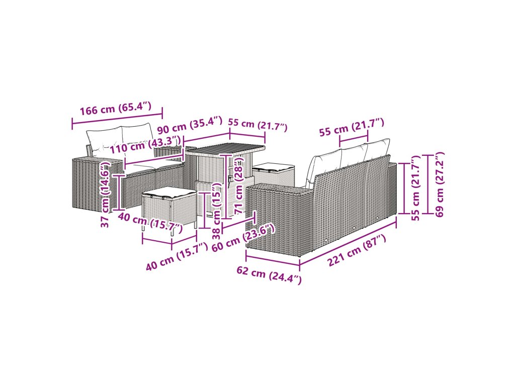 Tato modulová sada zahradního gauče je skvělou volbou pro každý moderní venkovní prostor, poskytuje pohodlí a univerzálnost. Je vyrobená z poly ratanu a masivního akáciového dřeva, má jednoduchý a elegantní design, který se hodí k různým stylům zahrad nebo teras. Ať už ji uspořádáš jako rohovku nebo jako přímou dvojici, gaučová sada splní různé potřeby sezení, takže je ideální na společenské akce nebo na odpočinek.