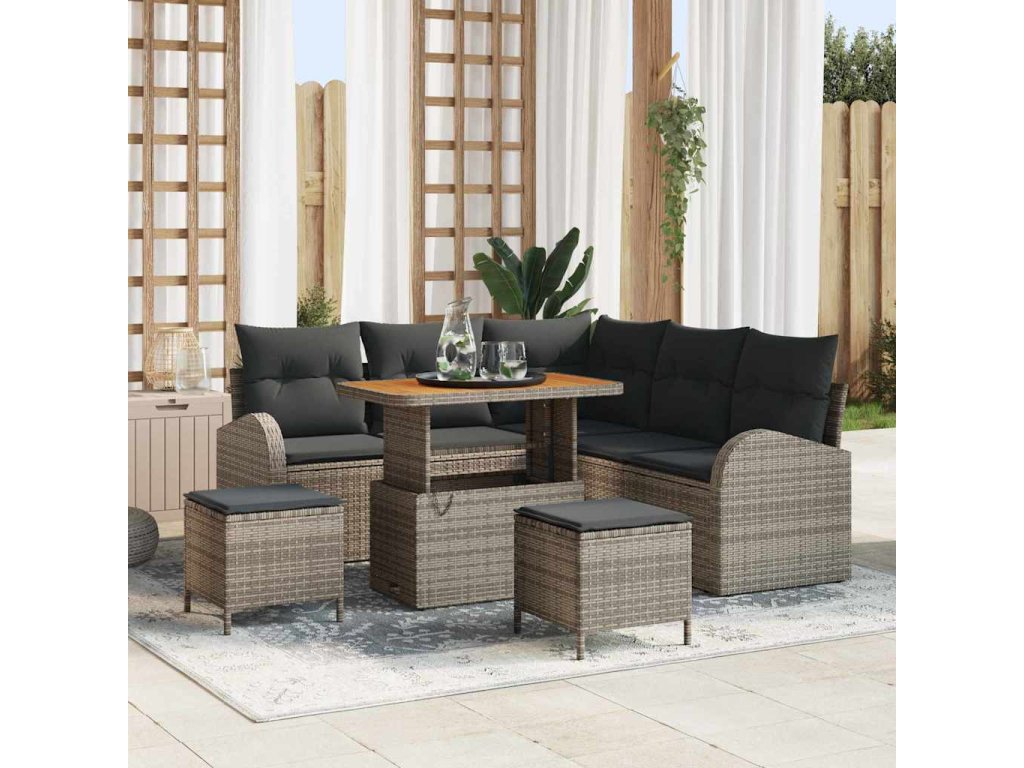 - Materiály: Vyrobeno z poly ratanu a polyesteru, což zajišťuje odolnost a styl. Poly ratan je weather-resistant a drží si tvar. Materiál také odolává UV záření a blednutí, takže set zůstává svěží a pěkný po celý rok.