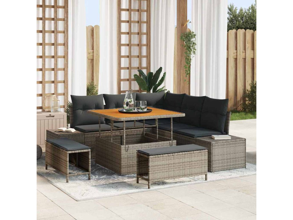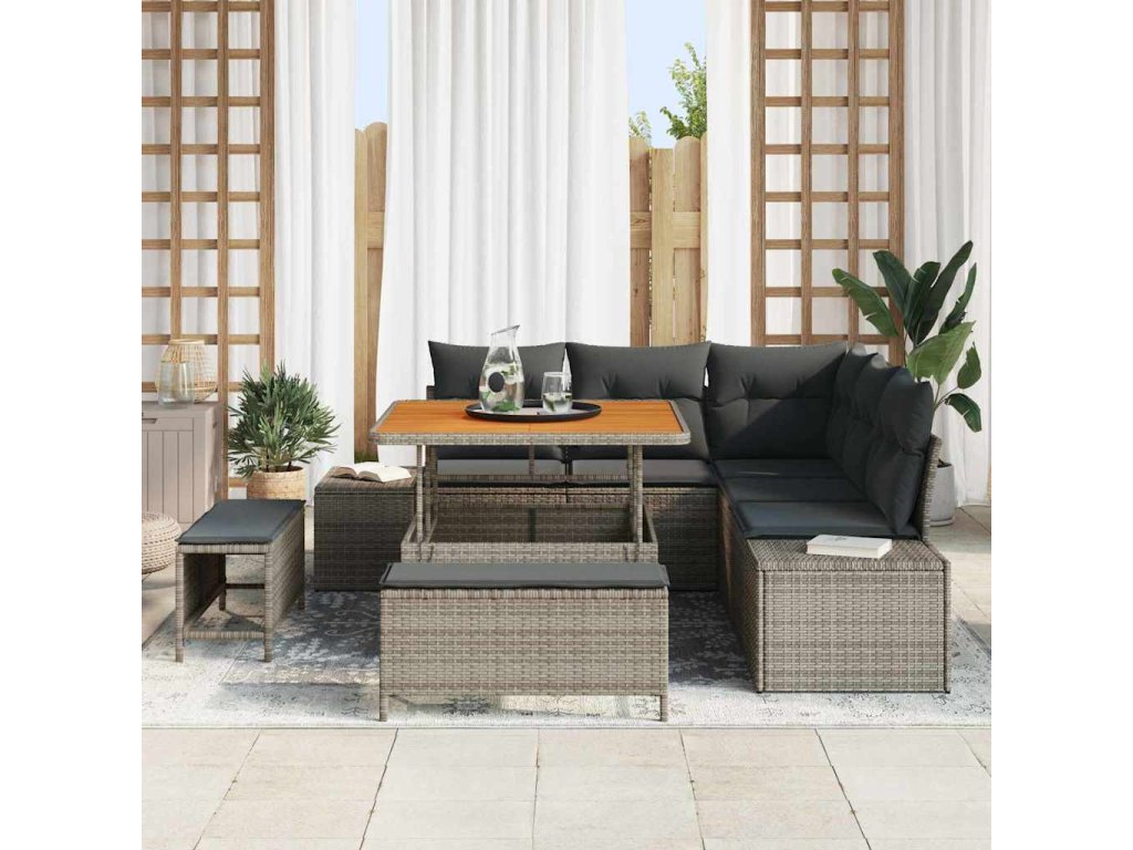 - Materiál: Vyrobeno z poly ratanového povrchu, který dobře vypadá a odolává opotřebení. Robustní ocelový rám drží vše pohromadě, zatímco pohodlné polyesterové polštáře zvládnou venkovní podmínky.