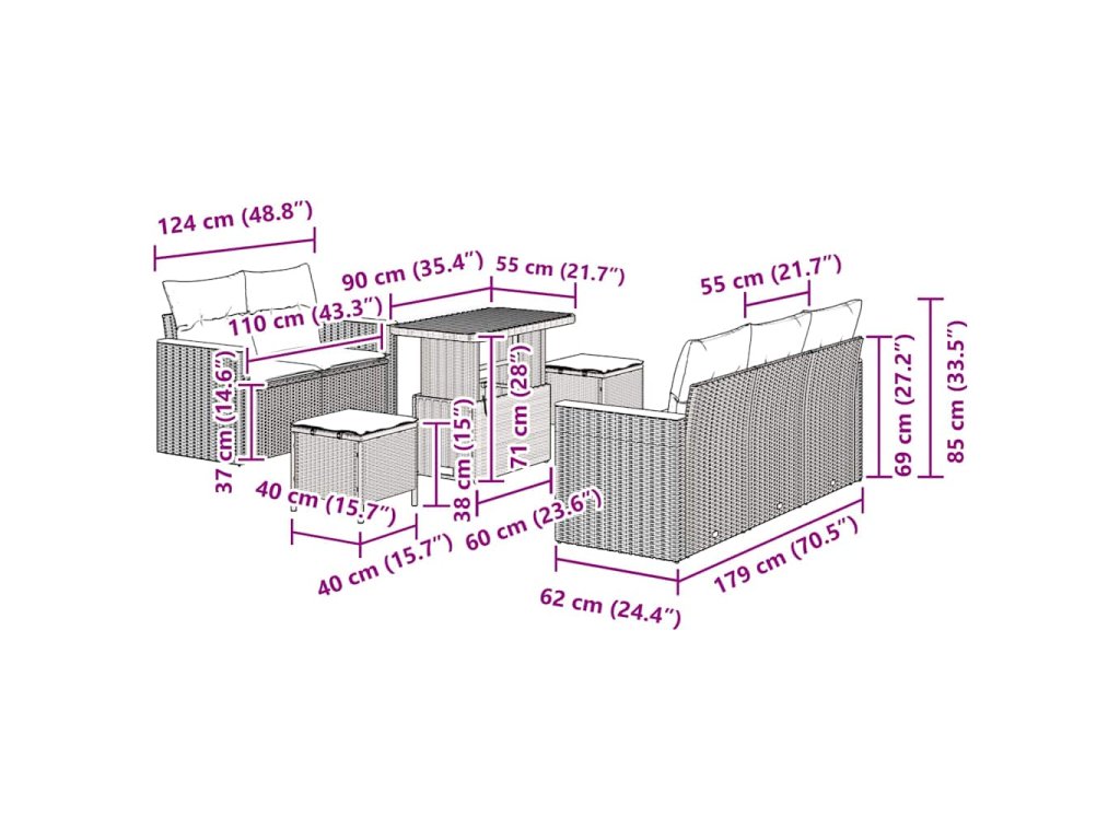 - Součásti: Je plně vybavená se čtyřmi pohovkami s opěrkami, jedním středním sedadlem, dvěma čtvercovými stoličkami a stolem. Každý kus je navržen pro pohodlné odpočívání a flexibilní uspořádání podle tvého gusta.
