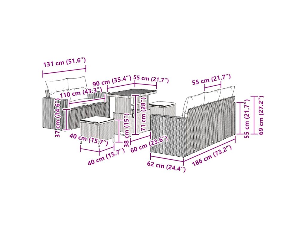 - Funkční úložné možnosti: Skryté úložné prostory jsou v lavicích a ottomanech. Ideální na uchování polštářů nebo dek, takže máte vše po ruce. To maximalizuje prostor a udržuje venkovní zónu uklizenou a šik.