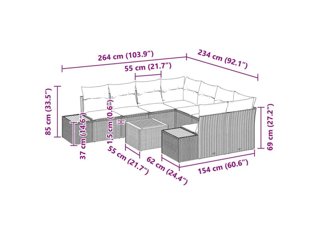 - Komplexní komponenty: Tento set zahrnuje čtyři středové sedačky, dvě rohové sedačky, dvě boční pohovky a jeden zahradní stůl, což z něj činí ideální pro větší skupiny. Každý kus je pečlivě navržen tak, aby maximalizoval pohodlí a užitečnost ve venkovním prostředí.