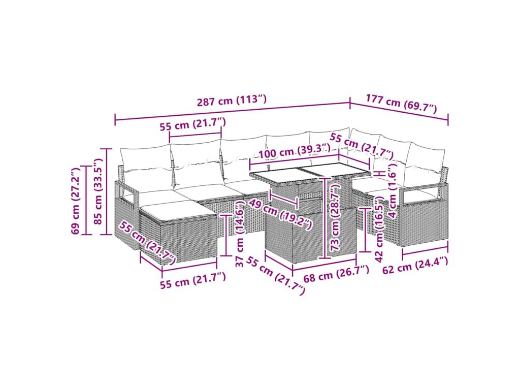 - Součásti soupravy: Souprava má rohové sedadlo, čtyři centrální sedáky, dvě pohovky s opěrkami, stůl a taburet. Každý kousek má svůj význam a dohromady vytvářejí stylový celek. Záda a opěrky jsou z poly ratanu, což dodává ergonomickou podporu a zvyšuje pohodlí během dlouhého používání.
