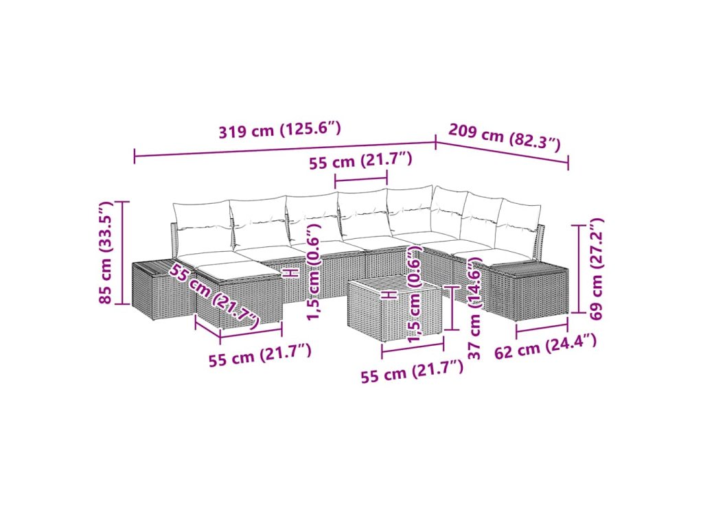 Tento zahradní pohovkový set krásně spojuje moderní estetiku s funkční flexibilitou, vhodnou pro jakékoliv venkovní prostředí, jako je zahrada nebo terasa. Jeho štíhlý obdélníkový tvar nabízí jemnou tkanou texturu, která vyzařuje jednoduchost a eleganci a vytváří příjemnou atmosféru. Navržen pro venkovní použití, set zahrnuje nastavitelné prvky, které poskytují jak pohodlí, tak styl pro společenská setkání nebo klidnou reflexi.