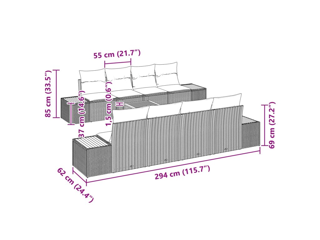 - Co je zahrnuto: Set obsahuje čtyři středové sedáky a čtyři pohovky s vestavěným úložným prostorem. Nechybí ani zahradní stůl a všechny části mají voděodolné obaly. Tento chytrý design spojuje styl s praktičností a dává vám dost místa na uschování věcí, zatímco si užíváte venku.