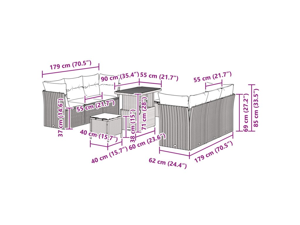 - 2 x Střední sezení: 55 x 62 x 85 cm (ŠxHxV)