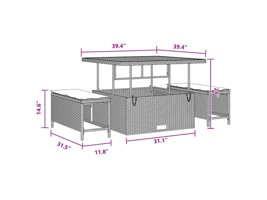 - Zahrnuté komponenty: Tento set má široké opěrky rukou z poly ratanu, dokončený zadní panel pro hezký vzhled a masivní akáciový stůl, který parádně ladí s vaším venkovním dekorem. Sloupové nohy dodávají stabilitu a rustikální nádech.